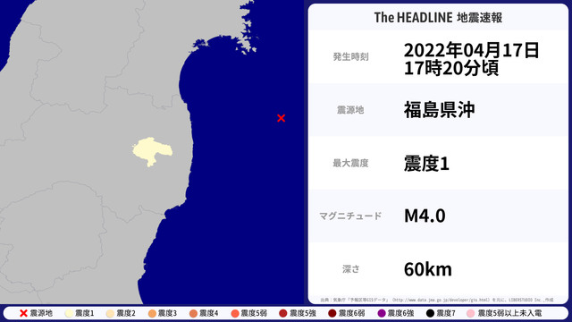 04月17日17時20分頃、福島県沖を震源とするマグニチュード4.0の地震が観測された。最大震度1を観測したのは、福島県。