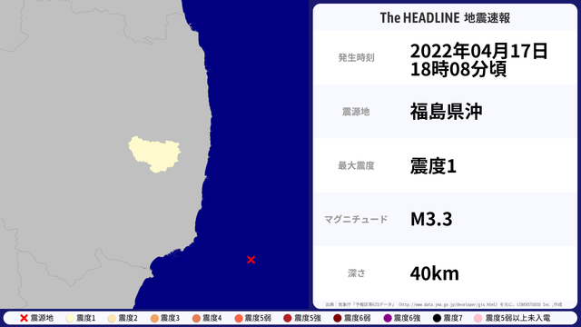 04月17日18時08分頃、福島県沖を震源とするマグニチュード3.3の地震が観測された。最大震度1を観測したのは、福島県。