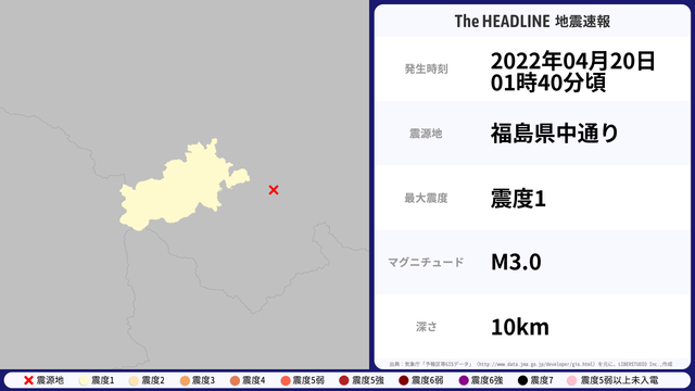 04月20日01時40分頃、福島県中通りを震源とするマグニチュード3.0の地震が観測された。最大震度1を観測したのは、福島県。