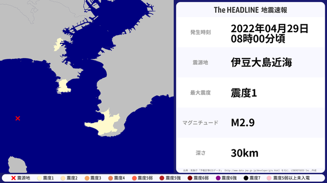 04月29日08時00分頃、伊豆大島近海を震源とするマグニチュード2.9の地震が観測された。最大震度1を観測したのは、千葉県・神奈川県。