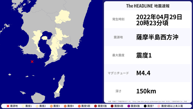 04月29日20時23分頃、薩摩半島西方沖を震源とするマグニチュード4.4の地震が観測された。最大震度1を観測したのは、宮崎県・鹿児島県。