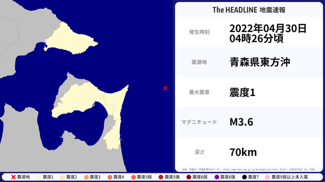 04月30日04時26分頃、青森県東方沖を震源とするマグニチュード3.6の地震が観測された。最大震度1を観測したのは、北海道・青森県。