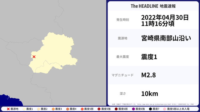 4月30日11時16分頃、宮崎県で最大震度1を観測する地震がありました。