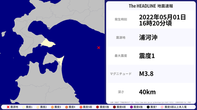 05月01日16時20分頃、浦河沖を震源とするマグニチュード3.8の地震が観測された。最大震度1を観測したのは、北海道・青森県。
