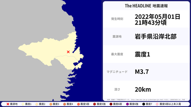 05月01日21時43分頃、岩手県沿岸北部を震源とするマグニチュード3.7の地震が観測された。最大震度1を観測したのは、岩手県。
