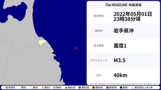 05月01日23時38分頃、岩手県沖を震源とするマグニチュード3.5の地震が観測された。最大震度1を観測したのは、青森県。
