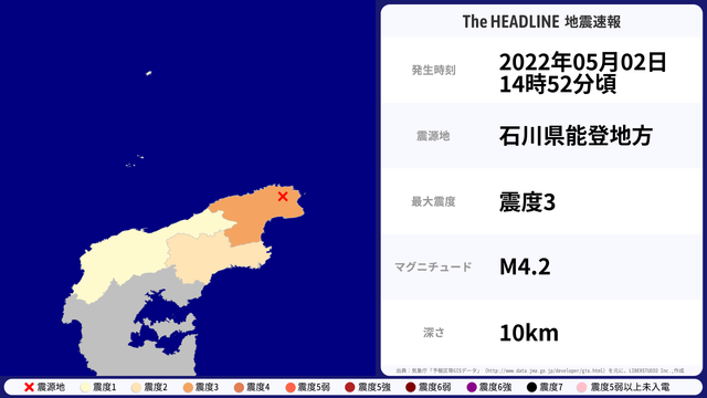 5月2日14時52分頃、石川県で最大震度3を観測する地震がありました。