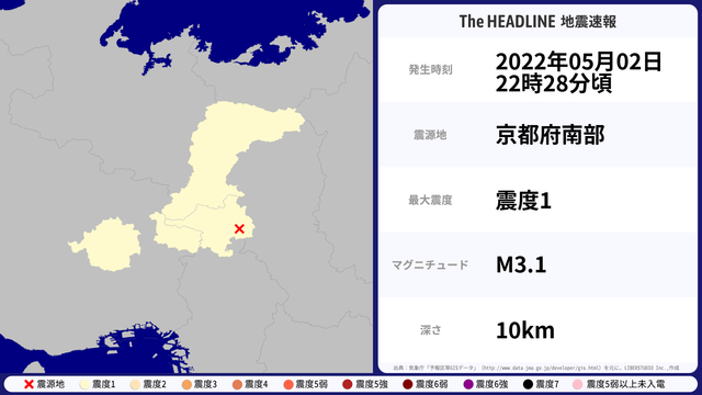 05月02日22時28分頃、京都府南部を震源とするマグニチュード3.1の地震が観測された。最大震度1を観測したのは、京都府・大阪府など。