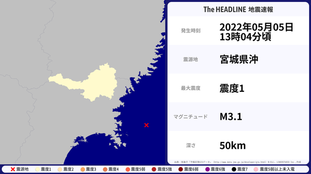 05月05日13時04分頃、宮城県沖を震源とするマグニチュード3.1の地震が観測された。最大震度1を観測したのは、岩手県。