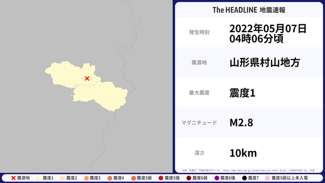 05月07日04時06分頃、山形県村山地方を震源とするマグニチュード2.8の地震が観測された。最大震度1を観測したのは、山形県。