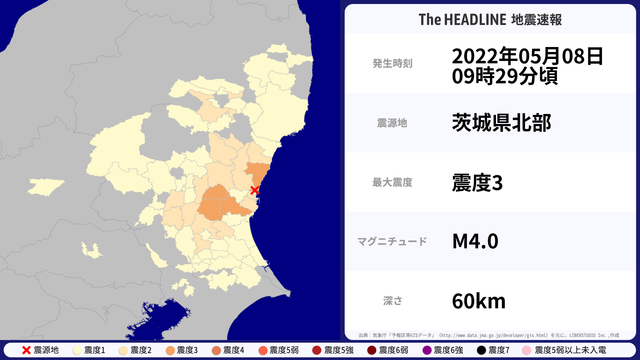 5月8日09時29分頃、茨城県で最大震度3を観測する地震がありました。