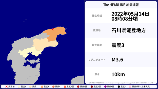 05月14日08時08分頃、石川県能登地方を震源とするマグニチュード3.6の地震が観測された。最大震度3を観測したのは、石川県。