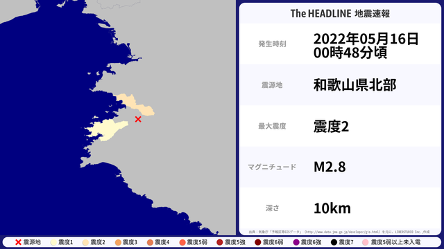 5月16日00時48分頃、和歌山県で最大震度2を観測する地震がありました。