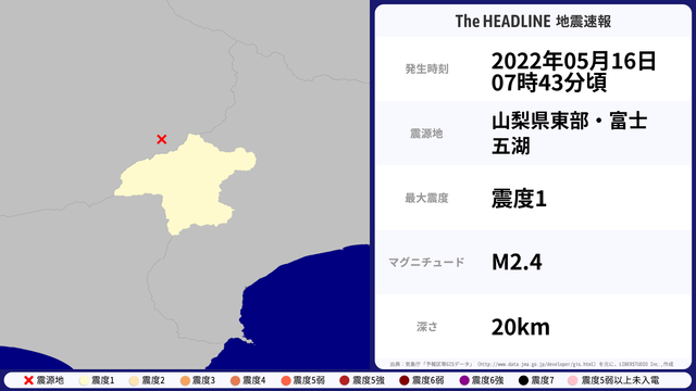 05月16日07時43分頃、山梨県東部・富士五湖を震源とするマグニチュード2.4の地震が観測された。最大震度1を観測したのは、神奈川県。