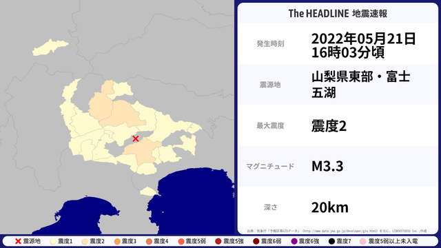 05月21日16時03分頃、山梨県東部・富士五湖を震源とするマグニチュード3.3の地震が観測された。最大震度2を観測したのは、神奈川県・山梨県。