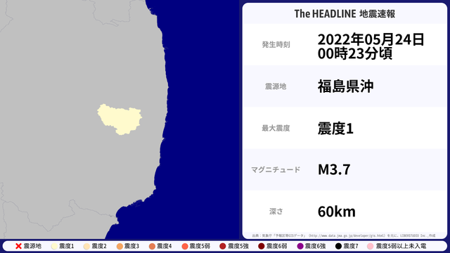 05月24日00時23分頃、福島県沖を震源とするマグニチュード3.7の地震が観測された。最大震度1を観測したのは、福島県。