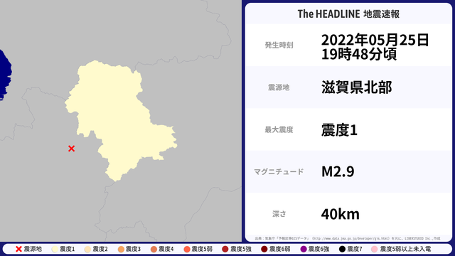 05月25日19時48分頃、滋賀県北部を震源とするマグニチュード2.9の地震が観測された。最大震度1を観測したのは、岐阜県。