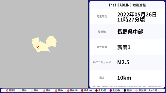 05月26日11時27分頃、長野県中部を震源とするマグニチュード2.5の地震が観測された。最大震度1を観測したのは、長野県。