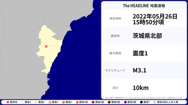 5月26日15時50分頃、茨城県で最大震度1を観測する地震がありました。