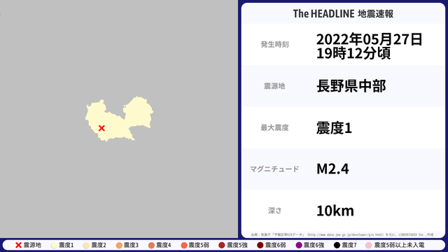 05月27日19時12分頃、長野県中部を震源とするマグニチュード2.4の地震が観測された。最大震度1を観測したのは、長野県。