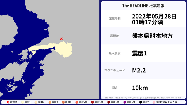 05月28日01時17分頃、熊本県熊本地方を震源とするマグニチュード2.2の地震が観測された。最大震度1を観測したのは、熊本県。