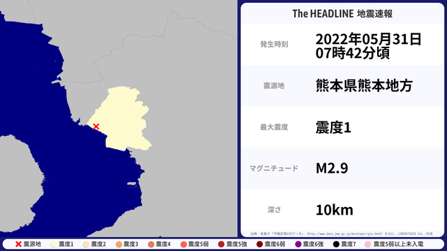 05月31日07時42分頃、熊本県熊本地方を震源とするマグニチュード2.9の地震が観測された。最大震度1を観測したのは、熊本県。