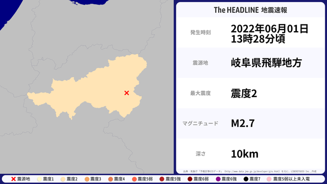 6月1日13時28分頃、岐阜県で最大震度2を観測する地震がありました。