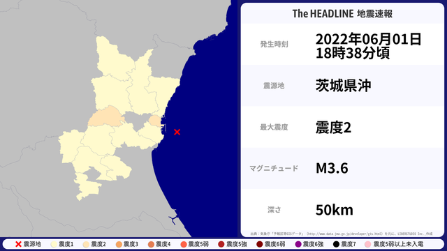 06月01日18時38分頃、茨城県沖を震源とするマグニチュード3.6の地震が観測された。最大震度2を観測したのは、茨城県。