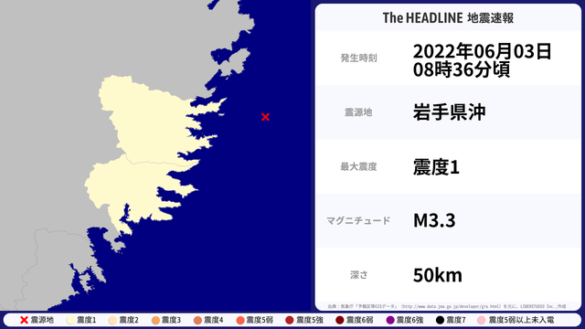 06月03日08時36分頃、岩手県沖を震源とするマグニチュード3.3の地震が観測された。最大震度1を観測したのは、岩手県。