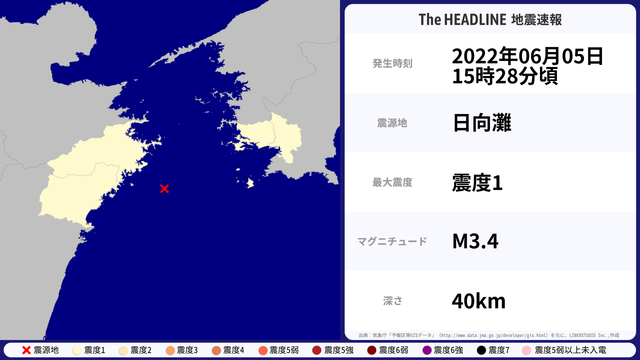 06月05日15時28分頃、日向灘を震源とするマグニチュード3.4の地震が観測された。最大震度1を観測したのは、愛媛県・高知県など。