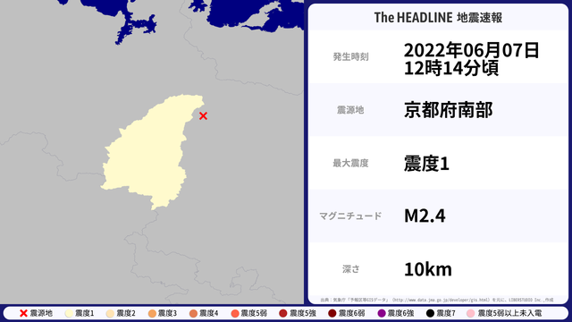 06月07日12時14分頃、京都府南部を震源とするマグニチュード2.4の地震が観測された。最大震度1を観測したのは、京都府。