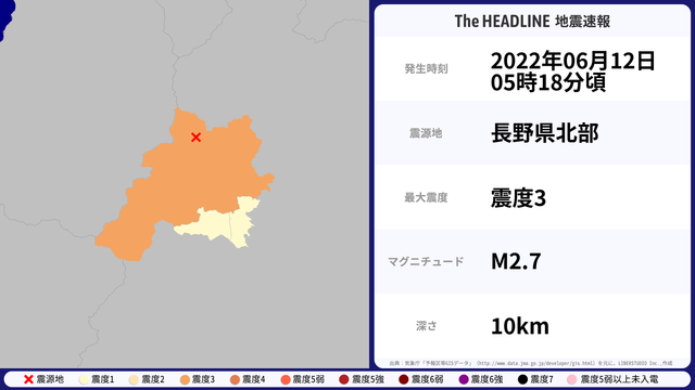 06月12日05時18分頃、長野県北部を震源とするマグニチュード2.7の地震が観測された。最大震度3を観測したのは、長野県。