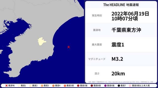 06月19日10時07分頃、千葉県東方沖を震源とするマグニチュード3.2の地震が観測された。最大震度1を観測したのは、千葉県。