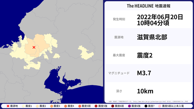 06月20日10時04分頃、滋賀県北部を震源とするマグニチュード3.7の地震が観測された。最大震度2を観測したのは、岐阜県・滋賀県。