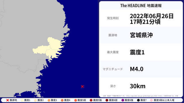 06月26日17時21分頃、宮城県沖を震源とするマグニチュード4.0の地震が観測された。最大震度1を観測したのは、岩手県。