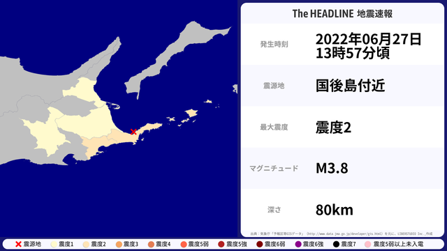 06月27日13時57分頃、国後島付近を震源とするマグニチュード3.8の地震が観測された。最大震度2を観測したのは、北海道。