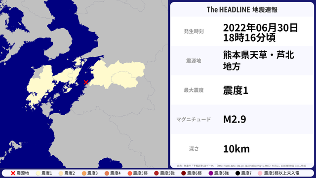 06月30日18時16分頃、熊本県天草・芦北地方を震源とするマグニチュード2.9の地震が観測された。最大震度1を観測したのは、熊本県。