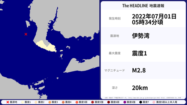 07月01日05時34分頃、伊勢湾を震源とするマグニチュード2.8の地震が観測された。最大震度1を観測したのは、愛知県。