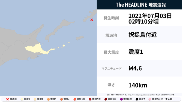 07月03日02時10分頃、択捉島付近を震源とするマグニチュード4.6の地震が観測された。最大震度1を観測したのは、北海道。