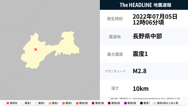 07月05日12時06分頃、長野県中部を震源とするマグニチュード2.8の地震が観測された。最大震度1を観測したのは、長野県。