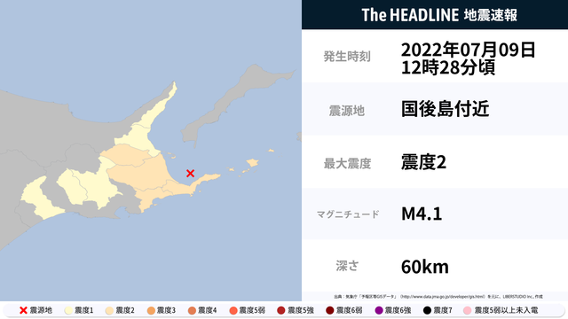 07月09日12時28分頃、国後島付近を震源とするマグニチュード4.1の地震が観測された。最大震度2を観測したのは、北海道。