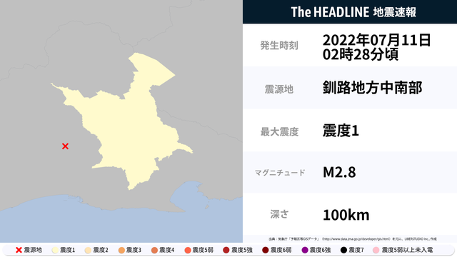 07月11日02時28分頃、釧路地方中南部を震源とするマグニチュード2.8の地震が観測された。最大震度1を観測したのは、北海道。