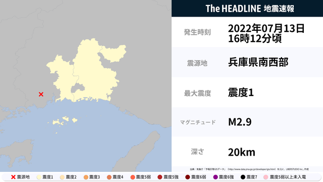 07月13日16時12分頃、兵庫県南西部を震源とするマグニチュード2.9の地震が観測された。最大震度1を観測したのは、兵庫県。