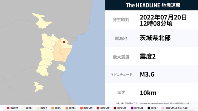 07月20日12時08分頃、茨城県北部を震源とするマグニチュード3.6の地震が観測された。最大震度2を観測したのは、茨城県。