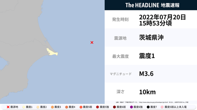 07月20日15時53分頃、茨城県沖を震源とするマグニチュード3.6の地震が観測された。最大震度1を観測したのは、千葉県。