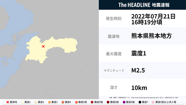 07月21日16時19分頃、熊本県熊本地方を震源とするマグニチュード2.5の地震が観測された。最大震度1を観測したのは、熊本県。