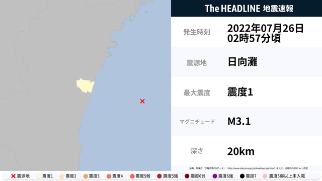 07月26日02時57分頃、日向灘を震源とするマグニチュード3.1の地震が観測された。最大震度1を観測したのは、宮崎県。