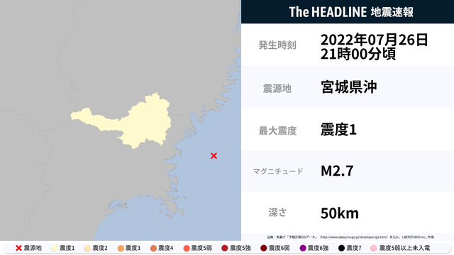 07月26日21時00分頃、宮城県沖を震源とするマグニチュード2.7の地震が観測された。最大震度1を観測したのは、岩手県。