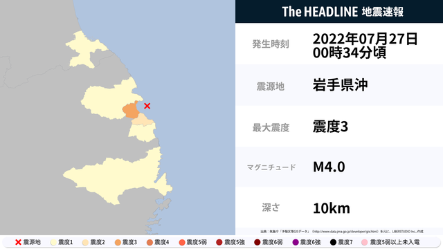 07月27日00時34分頃、岩手県沖を震源とするマグニチュード4.0の地震が観測された。最大震度3を観測したのは、岩手県。