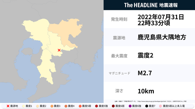 07月31日22時33分頃、鹿児島県大隅地方を震源とするマグニチュード2.7の地震が観測された。最大震度2を観測したのは、宮崎県。